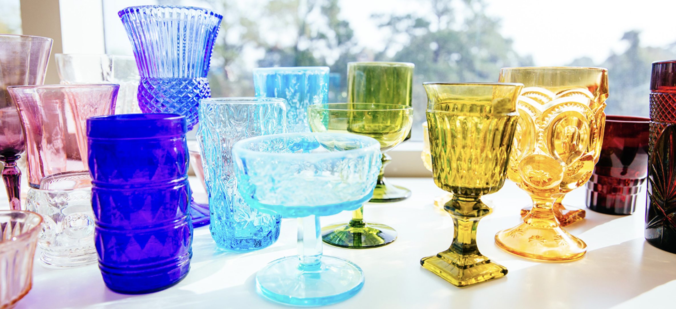 Colorful glassware including a pink cocktail glass, green, orange, purple, and blue drinking glasses, some with textured surfaces, along with two peaches on a white tablecloth.